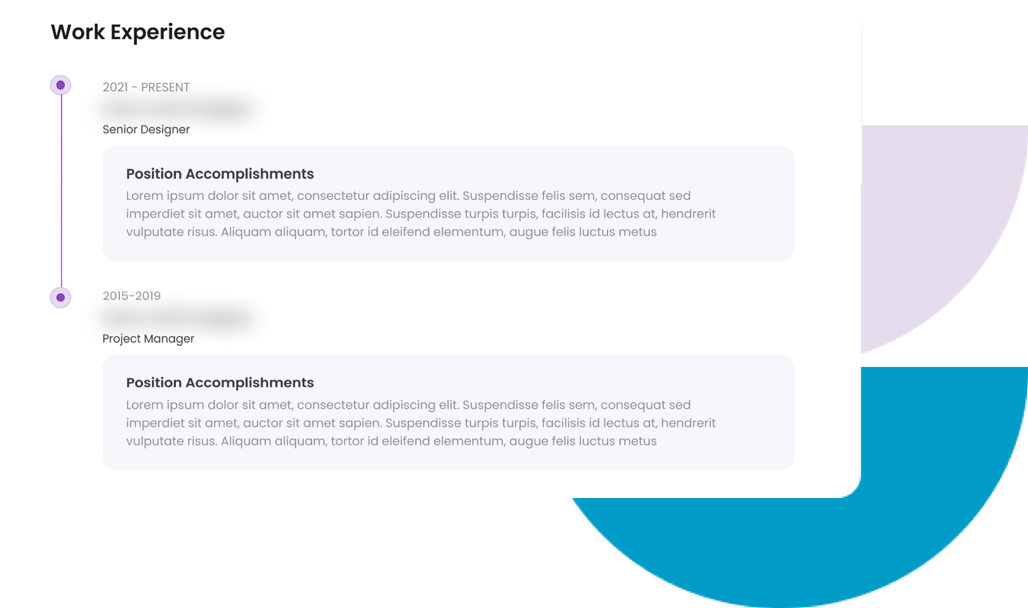As an addition to the traditional work history, you may specify your compelling accomplishments for each position, which can make you a more appealing candidate to potential employers.