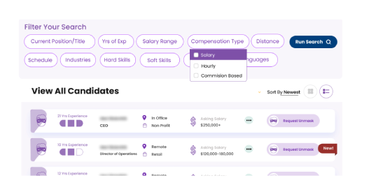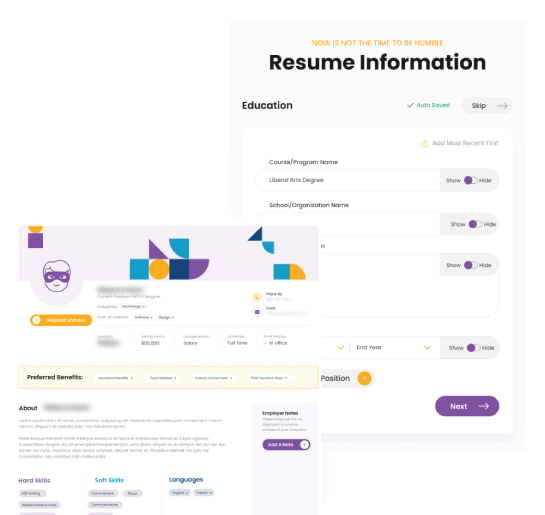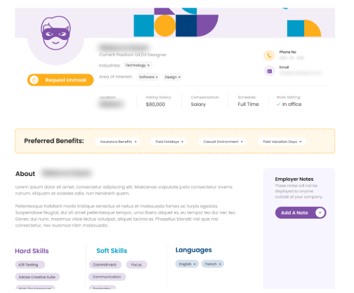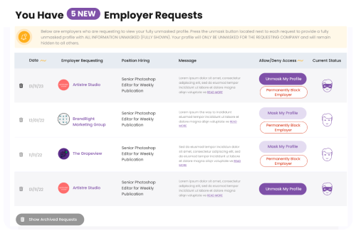 You hold the power of the platform by allowing selectively who gets to see your revealing details. After an employer requests additional information, you can decide if they and their available position are a good fit before unmasking yourself for that specific employer.