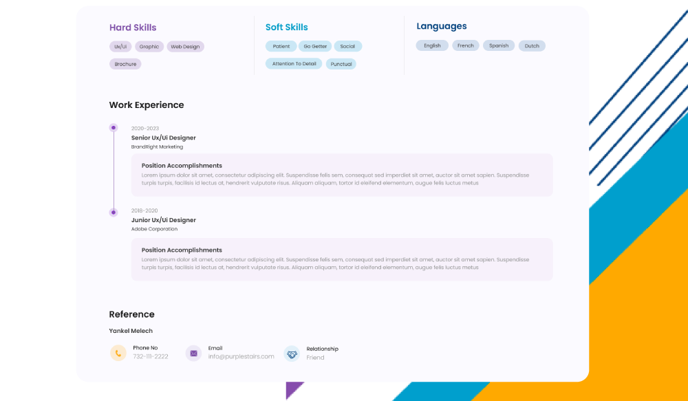 Based on your profile selections and work history, Purple Stairs generates a beautifully designed resume for you to download and use as you wish.